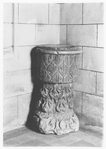 En forme de cuve cylindrique, il repose sur un chapiteau romain de marbre blanc.
