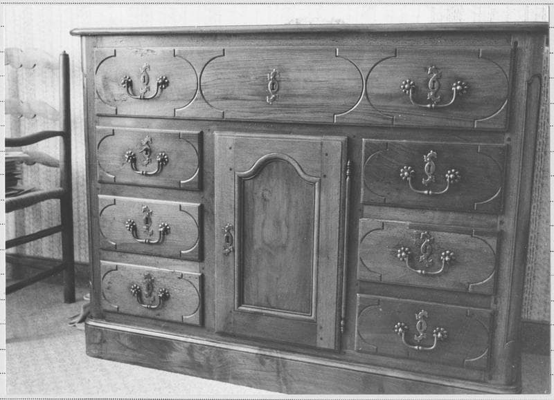 La commode s'ouvre par neuf tiroirs et une porte (un grand tiroir dans le haut et deux rangées de tiroirs qui flanquent une petite porte au centre). L'assemblage se fait par tenons, mortaises et chevilles. Toutes ces ouvertures sont munies d'entrées de serrures en fer.
