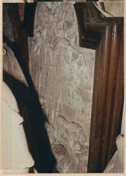 La scène est inscrite dans un panneau de bois rectangulaire cintré dans le haut. Ce demi-relief en terre cuite modelée, cintrée dans sa partie supérieure offre une polychromie encore très apparente et restituable dans les parties manquantes. L'encadrement autrefois en pierre a été remplacé par un cadre de bois qui alourdit l'oeuvre.