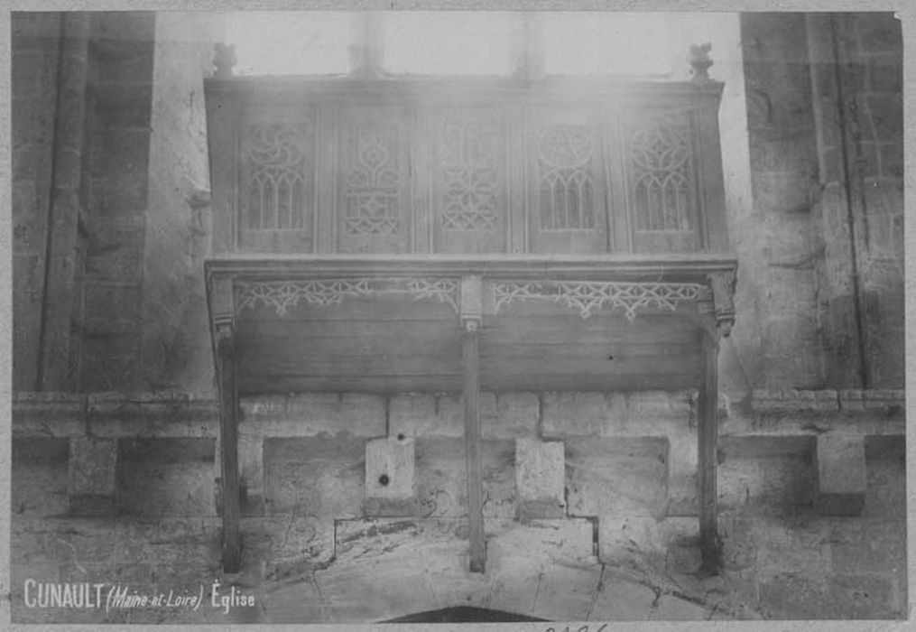 Sans datation. En réalité, il ne s'agit pas d'une tribune d'orgue mais d'une fausse petite tribune suspendue dans l'église et dépourvue de tout accès. Elle fut démontée, elle était composée de petits panneaux style XVe encastrés dans un bâti de chêne.
