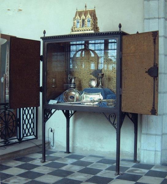 Dates : 1859-1863. Vitrine commandée par Edmond Du Sommerard pour présenter les huit couronnes wisigothiques achetées en 1859 par le musée de Cluny. Dessin de Viollet-le-Duc, réalisation par le serrurier Soisson. Achevée en 1860 pour 6000 fr. Peinture de rinceaux dorés par Denuelle en 1863. Viollet-le-Duc a réalisé des vitrines en bois, en particulier pour le trésor de la cathédrale Notre-Dame de Paris. Celles-ci sont atypiques dans la production qu'on lui connait. Les couronnes wisigothiques ont été rendues à l'Espagne au moment de la Seconde guerre mondiale. Le musée de Cluny a souhaité se défaire de la vitrine qui a été transférée au trésor de la cathédrale d'Angers à la demande de l'inspecteur général compétent.
