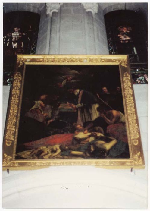 toile (support) : peinture à l'huile ; bois : taillé, doré ; plâtre : doré