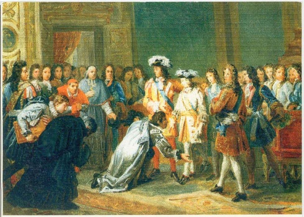 Au centre, Louis XIV présente son petit-fils, Philippe, duc d'Anjou et roi d'Espagne sous le nom de Philippe V. A droite, les princes : Monsieur, frère du roi de France, le Grand Dauphin, le duc de Bourgogne, le Prince de Conti, le duc du Maine, le duc de Bourbon ; à l'arrière-plan, Bossuet et le Père Lachaise ; à gauche, le ministre Torcy, Mansart, le duc de Villiers. Au premier plan, l'ambassadeur d'Espagne s'agenouille.
