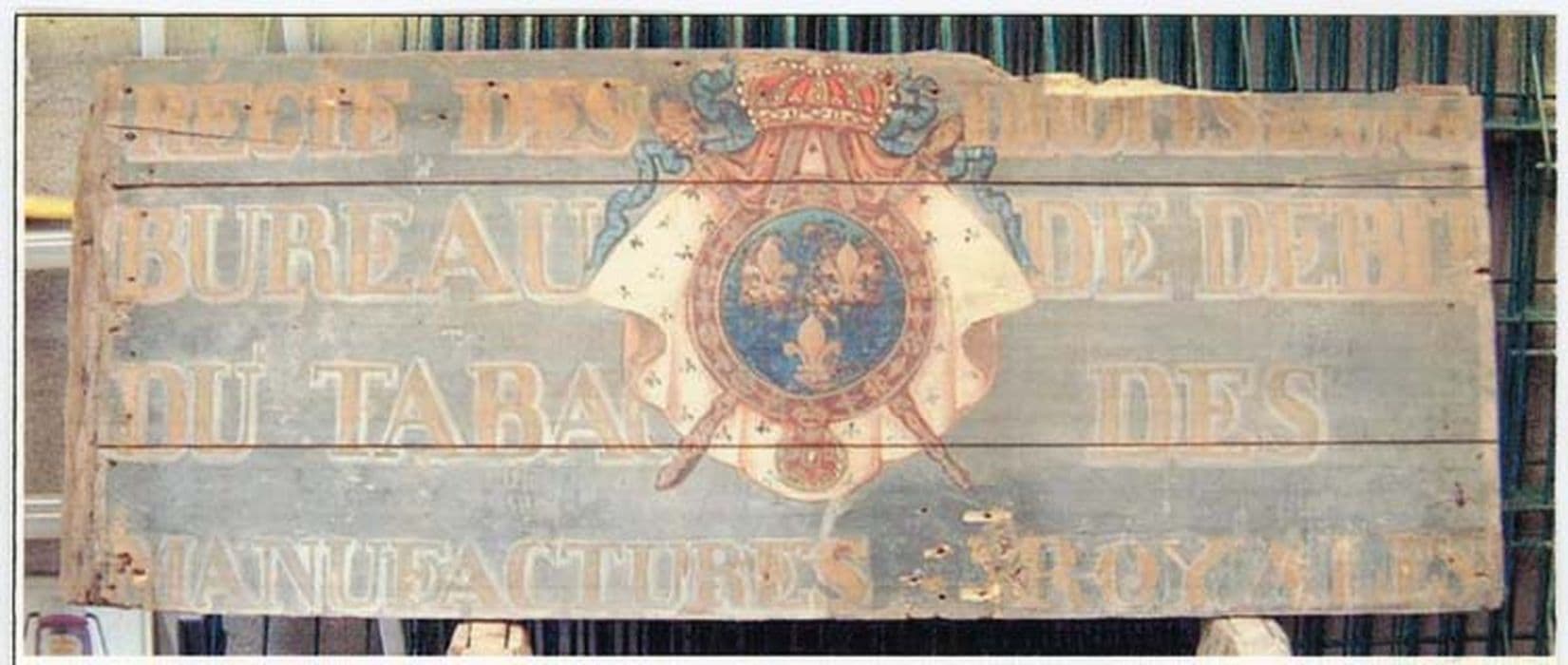 Plaque composée de trois planches emboîtées et reliées par trois traverses. Aux extrémités, la plaque est biaisée de sorte qu'elle puisse s'emboîter à d'autres et former la devanture d'une boutique.