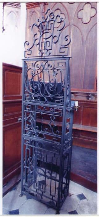 Lutrin à pupitre fixe, en fer forgé. Partie postérieure composée de trois panneaux à motifs géométriques surmontés d'un amortissement à motifs similaires encadrés par des fers à courbes et contre-courbes, le tout surmonté d'une croix. La partie avant est un cadre constitué de deux traverses supportant la base du pupitre. Elle supporte deux bougeoirs articulés.