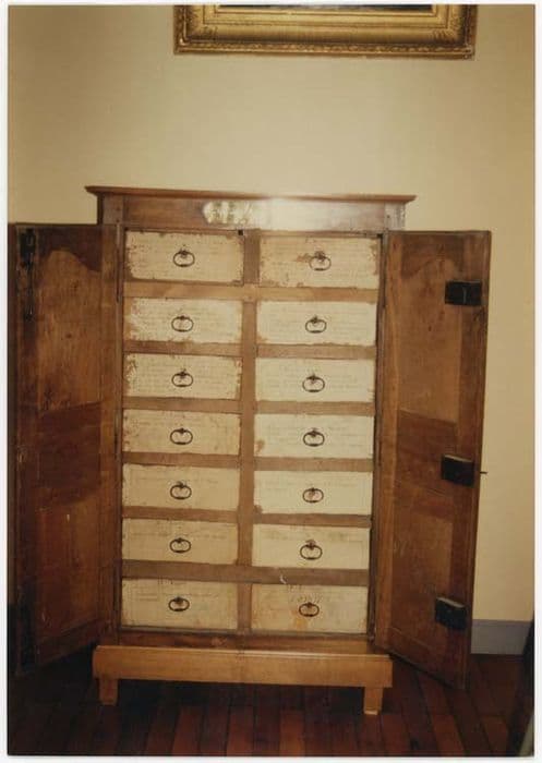 Meuble en chêne dont les côtés sont composés de trois panneaux et les portes de trois panneaux à double moulures et trois serrures. La traverse supérieure comporte un cartel en cuivre. A l'intérieur, deux rangées de sept tiroirs en chêne montés à queue d'aronde. Seules les traverses sous le tiroir supérieur et sous l'avant-dernier occupent toute la longueur. Les autres reposent sous le meneau central compris entre les traverses supérieures et inférieures. Chaque tiroir possède un poignée et une étiquette.