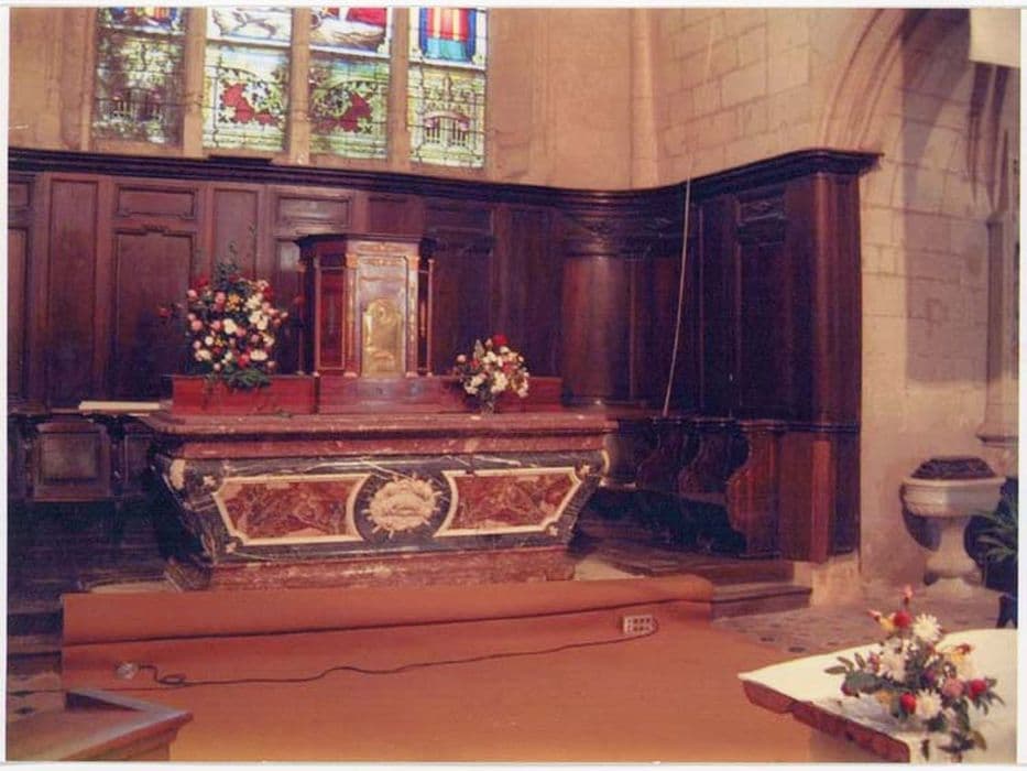 L'ensemble des stalles épouse le fond du choeur : deux stalles le long du mur nord, un dans l'angle, sept le long du mur oriental, un dans l'angle et deux le long du mur sud. Elles sont surmontées de boiseries. Les miséricordes sont de simples équerres. Les parcloses sont sculptées en partie basse d'une feuille d'acanthe, d'une gorge striée et d'une chute de feuille se terminant en volute. Le prie-Dieu central et les agenouilloirs ont été démontés.