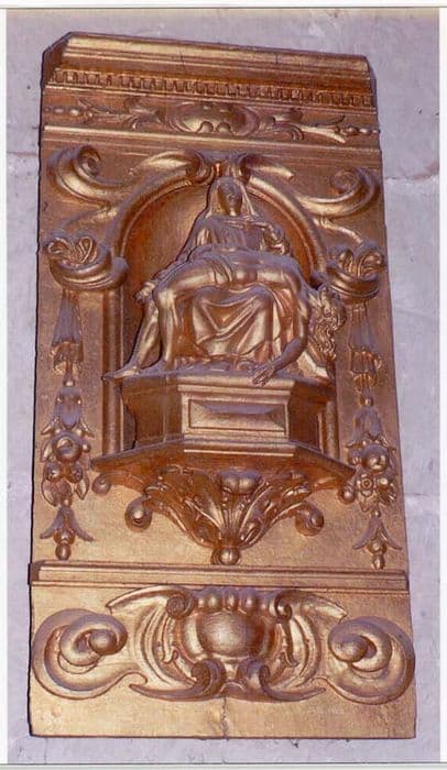 Elément de tabernacle en bois doré comprenant une niche en plein cintre sommée de deux volutes et encadrée de deux draperies s'achevant par des chutes de fruits et de fleurs. La niche abrite une statuette représentant la Vierge de Pitié reposant sur un culot sculpté de feuilles. Sur la plinthe, des volutes encadrent un cartouches.