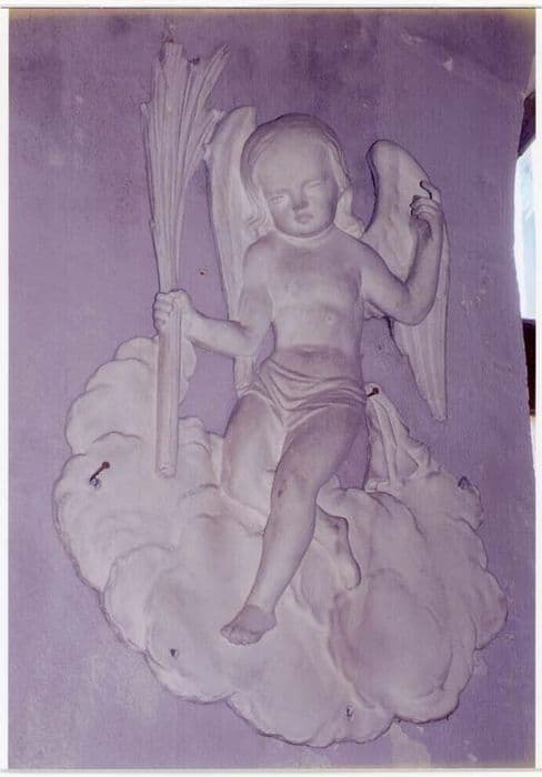 Sur des nuages en bas-relief, se détachent en très haut relief des anges ailés portant les instruments de la Passion : le marteau et les tenailles, l'éponge et le fouet, la couronne et les clous, et les roseaux. Deux regardent vers le haut et deux autres vers le bas. Ils encadraient probablement un Christ en croix.