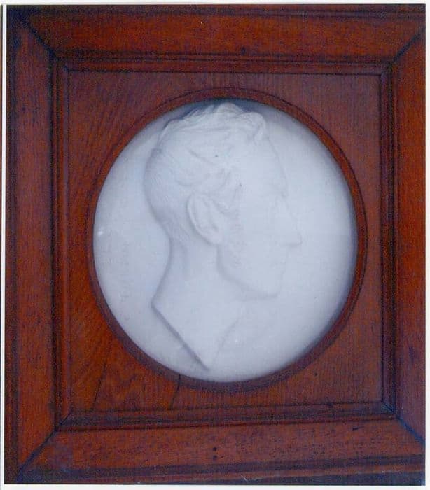 Bas-relief en plâtre de forme ovale dans un cadre en bois carré.