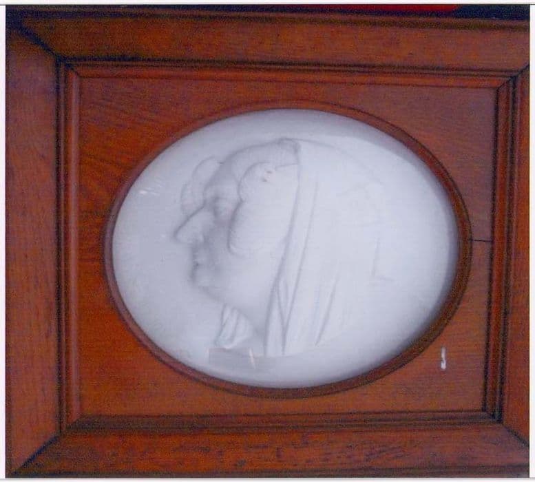 Bas-relief en plâtre de forme ovale dans un cadre en bois carré.