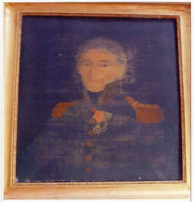 Portrait d'un officier en buste, de trois-quarts face, vêtu d'une veste d'uniforme sombre, à épaulettes et col brodé. Il porte une haute cravate noire. La croix de la Légion d'honneur et de l'ordre du Lys sont accrochées sur le côté gauche. Il pourrait s'agir du chevalier de Lostanges.