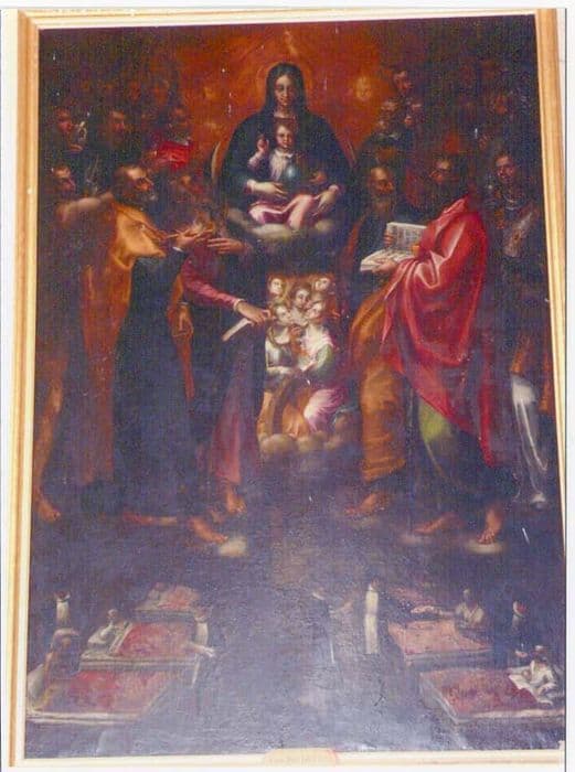 peste ; Vierge à l'Enfant : croissant de lune ; sainte Catherine de Sienne ; sainte Lucie ; saint Charles Borromée ; saint Paul de Tarse ; saint Janvier ; saint François d'Assise ; saint Pierre apôtre