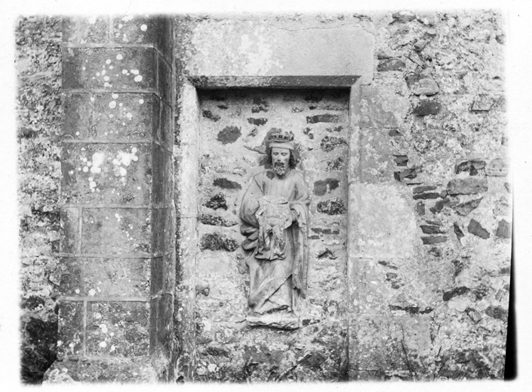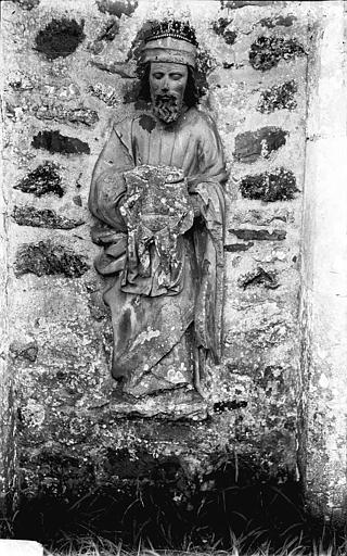Oeuvre anciennement datée du 13e ou du 14e siècle, et semble-t-il autrefois identifiée comme représentant la Trinité. Ce groupe a été autrefois remployé à l'extérieur dans la maçonnerie de la porte nord de la nef, puis ôté du mur en 1991-1992.