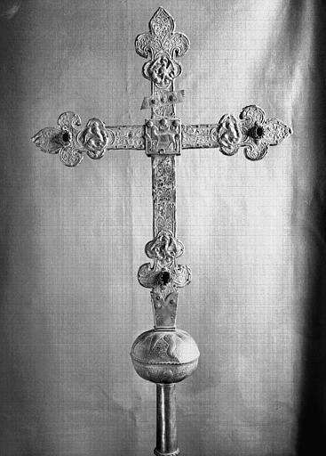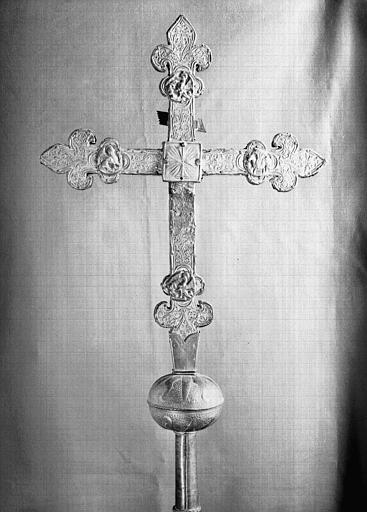 Cette croix de procession est constituée de feuilles de cuivre argenté clouées sur une âme de bois. Ses extrémités sont fleurdelysées, et, à l'origine, réhaussées de cabochons, qui ont semble-t-il disparu.