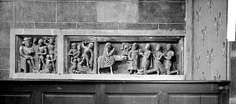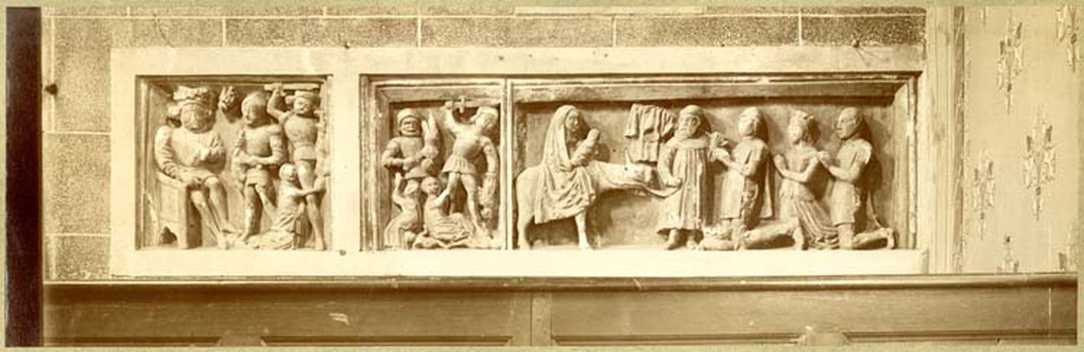 Ce bas-relief est en pierre calcaire sculptée, et comporte des traces de polychromie (ocre, rouge, vert). Il est divisé en trois compartiments, représentant le Massacre des Innocents, la Fuite en Egypte, et un roi à genoux, les mains jointes, peut-être Saint Louis, accompagné de deux chevaliers armés, peut-être les frères Pinchon, qui l'accompagnèrent en Palestine.