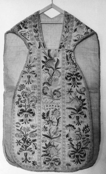 Ornements d'époque Louis XIV, ayant appartenu à M. l'abbé Lesple-Dupré, curé d'Avranches, et Vicaire Général de 1804 à 1837. La chasuble a manifestement été retaillée.