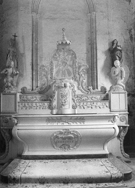 autel ; gradin d'autel (2) ; tabernacle ; exposition ; console (2) ; piédestal (2) ; statue (2)