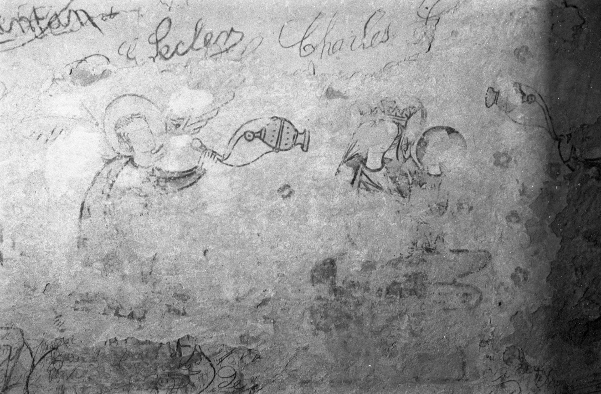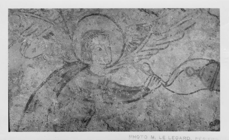 Peinture à la fresque ou à la colle. L'enduit, posé très irrégulièrement est composé de sable, de chaux et de terre argileuse. Sur le mur nord sont représentés la Vierge à l'Enfant, des anges et deux saints personnages, sur le mur sud, le Christ crucifié, la Vierge et saint Jean, sur le fond, un semis de fleurettes et une frise de rinceaux, et sur la voûte, la Vision de l'Apocalypse. La Vierge et l'Enfant évoquent les enluminures des livres d'heures des 13e et 14e siècles.