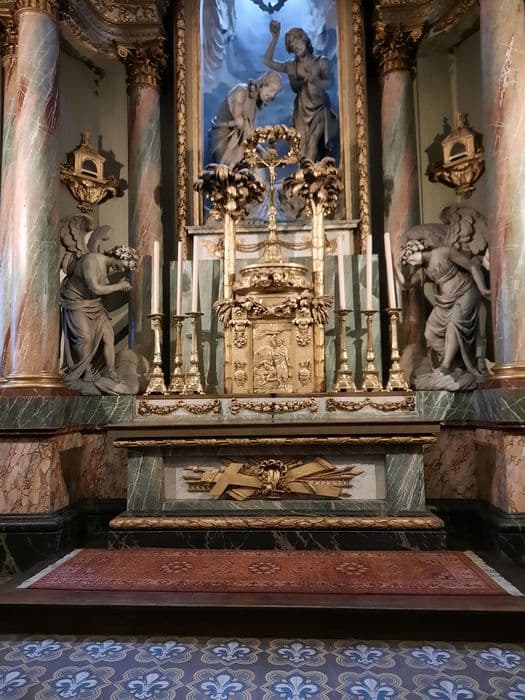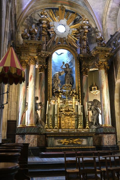 Cet autel est doté de gradins d'autel, d'un tabernacle, d'une exposition, d'une croix d'autel, de six chandeliers d'autel, d'un retable et d'un groupe sculpté représentant le Baptême du Christ.
