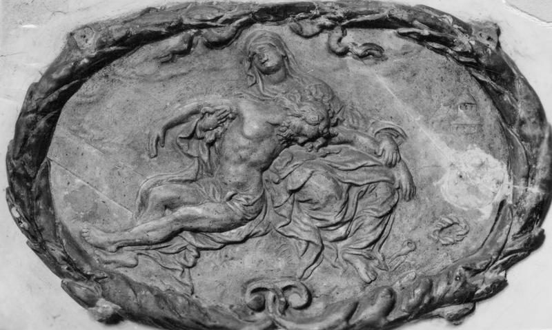 Oeuvre anciennement datée du 1er quart 18e siècle. Ce bas-relief provient d'un devant d'autel exécuté dans les années 1845-1849, date de l'ancien maître-autel. Vierge de Pitié d'après Otto Van Veen (tableau à Fribourg-en-Brisgau, Augustinermuseum).
