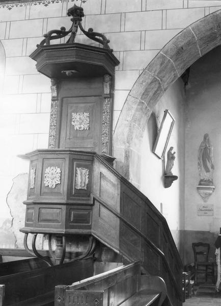 La chaire, en bois mouluré et peint, comprend une cuve, un escalier, un abat-voix avec la colombe et son couronnement. Les appliques sont en bois sculpté et doré.