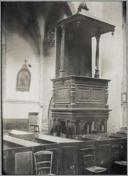 La tribune, de forme cubique, se compose de panneaux moulurés, cantonnés de pilastres. Elle repose sur des colonnes ioniques réunies entre elles par des cintres. L'abat-voix pyramidal est soutenu par deux colonnes d'ordre composite.