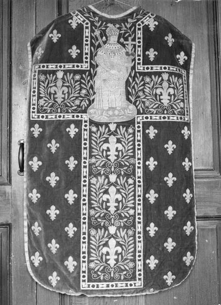 Chasuble à l'effigie de saint Louis, ornée de fleurs de lys. Velours rouge avec applications de broderie précedemment sur un ornement en velours bleu.