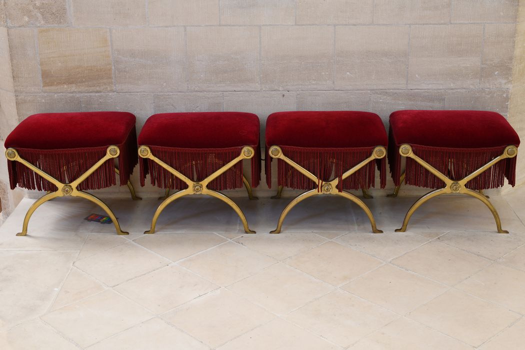 Ensemble formé par quatre fauteuils sans accoudoirs et huit tabourets, avec armature en X. Cuivre doré, velours rouge, franges en laine.