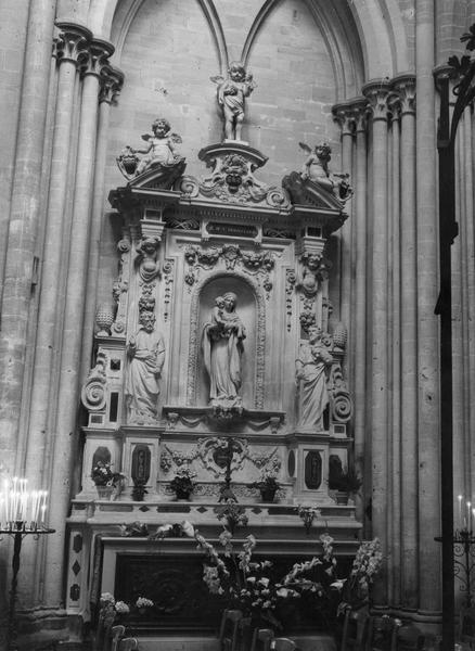 autel de la Chapelle du Puits, retable, statue : Vierge à l'Enfant, 2 statuettes : Angelots