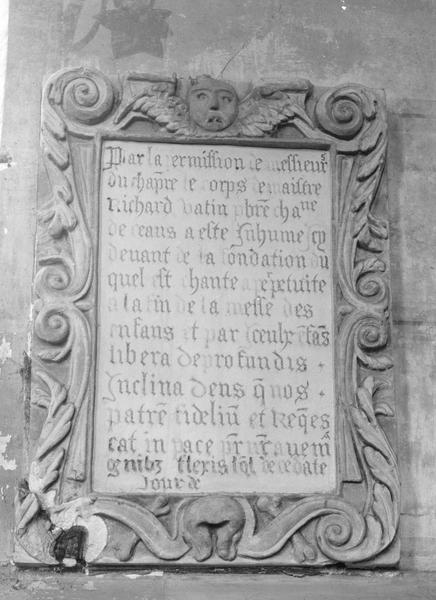 plaque funéraire de Richard Vatin, prêtre et chanoine de Coutances, et son cadre
