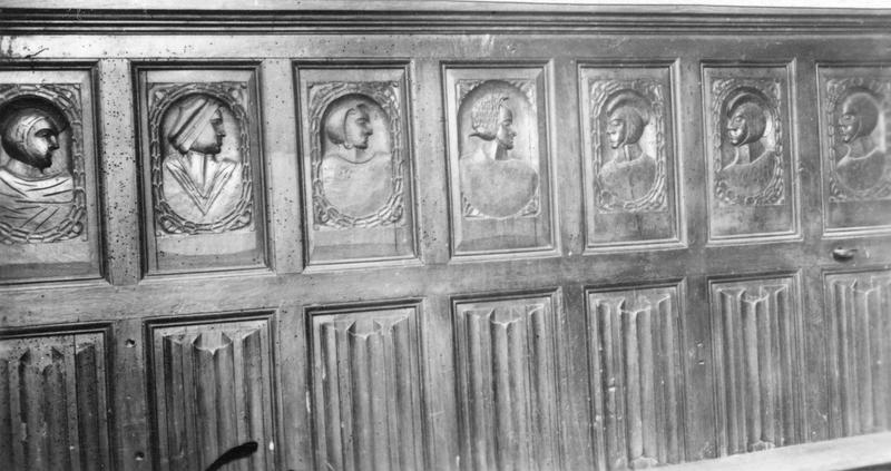 Lambris du mur nord du sanctuaire, comportant sept médaillons à profils d'hommes et de femmes.
