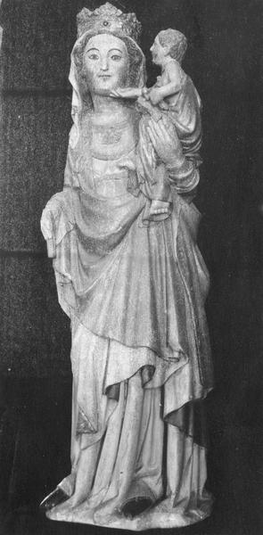 La Vierge tient de la main droite une tige, dont l'extrémité supérieure a disparu (sceptre ou fleur de lys). La tête de l'Enfant semble avoir été refaite.