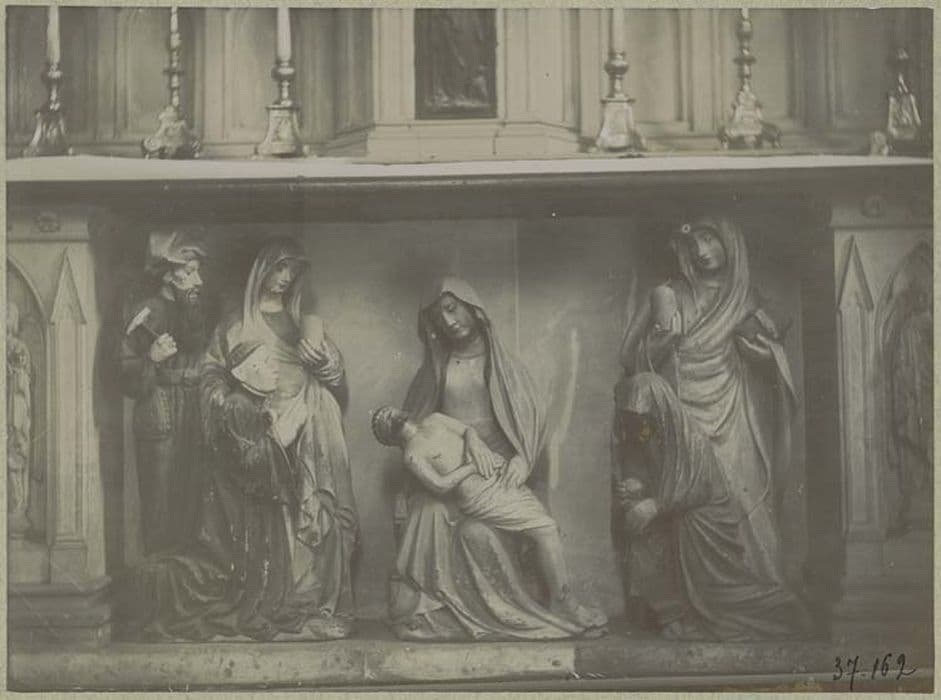 Ce groupe représente plus exactement la Mise au Tombeau. La Vierge de Pitié est accompagnée de sept personnages, répartis en trois groupes et une statue isolée : Nicodème ou personnage civil, avec un donateur accompagné d'une sainte femme, deux autres saintes femmes accompagnées d'un enfant, et enfin, une autre sainte femme (statue isolée).