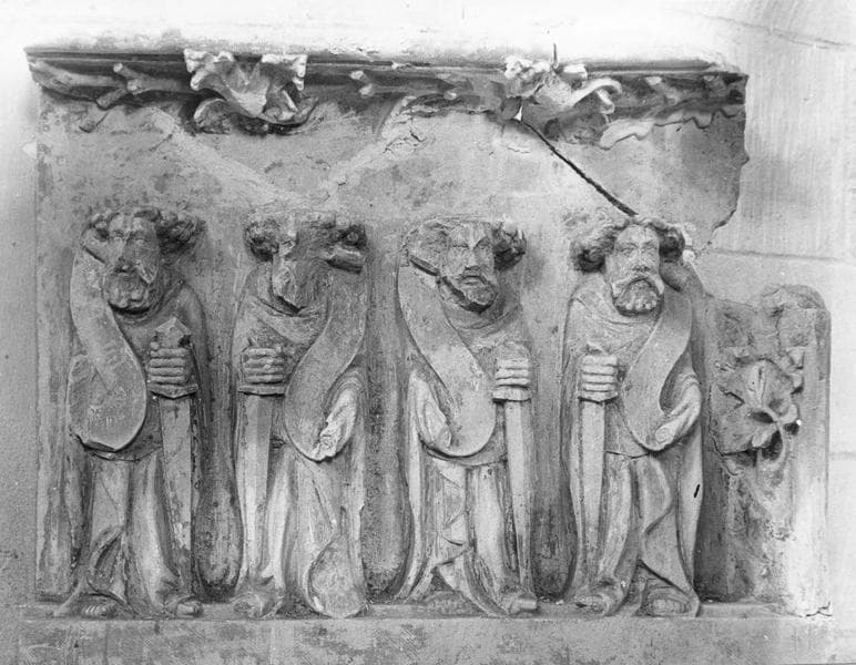 Ces bas-reliefs sont des fragments d'un retable aux douze apôtres en pierre calcaire, présentant des traces de polychromie.