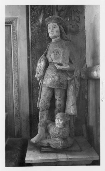 Cette statue, en pierre calcaire polychromée (bleu, vert, rouge, rose) et dorée à la feuille, est mutilée : saint Martin est décapité. Le donateur, agenouillé, présente un phylactère. Le revers est travaillé.