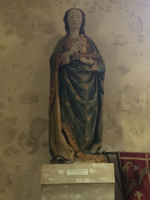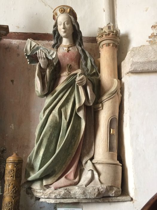 La statue de sainte Barbe ets en pierre calcaire peinte, et celle de sainte Madeleine, en pierre calcaire polychrome.