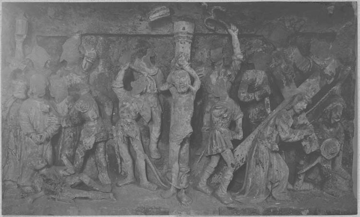Ces trois bas-reliefs proviennent d'un retable de la Passion. Ils représentent respectivement l'arrestation de Jésus, la Flagellation, et la Montée au Calvaire, ainsi que la Crucifixion, la Mise au tombeau, et la Résurrection, puis, la descente aux limbes. Le visage du Christ lié au poteau a disparu.