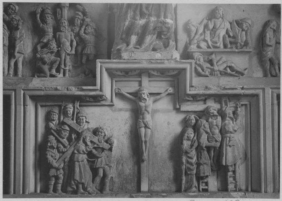 Ces bas-reliefs, anciennement datés du 16e siècle, sont de la même main, sinon du même atelier, que les retables aux Apôtres de Martinvast et d'Urville-Bocage. Ils ont été remontés.