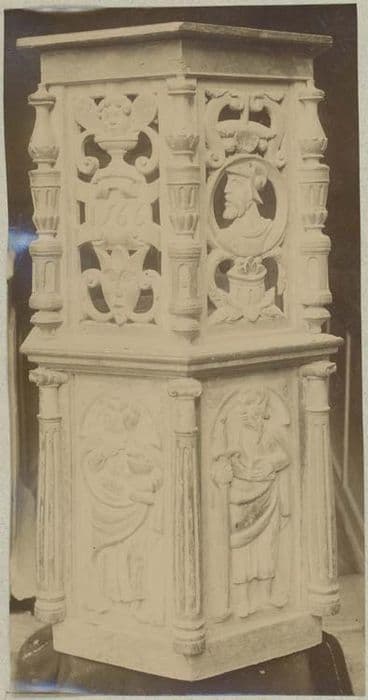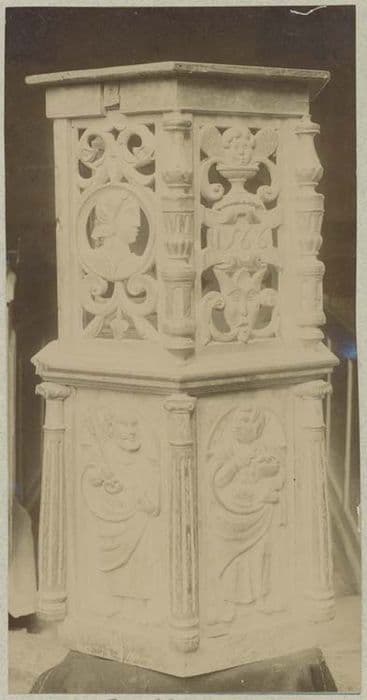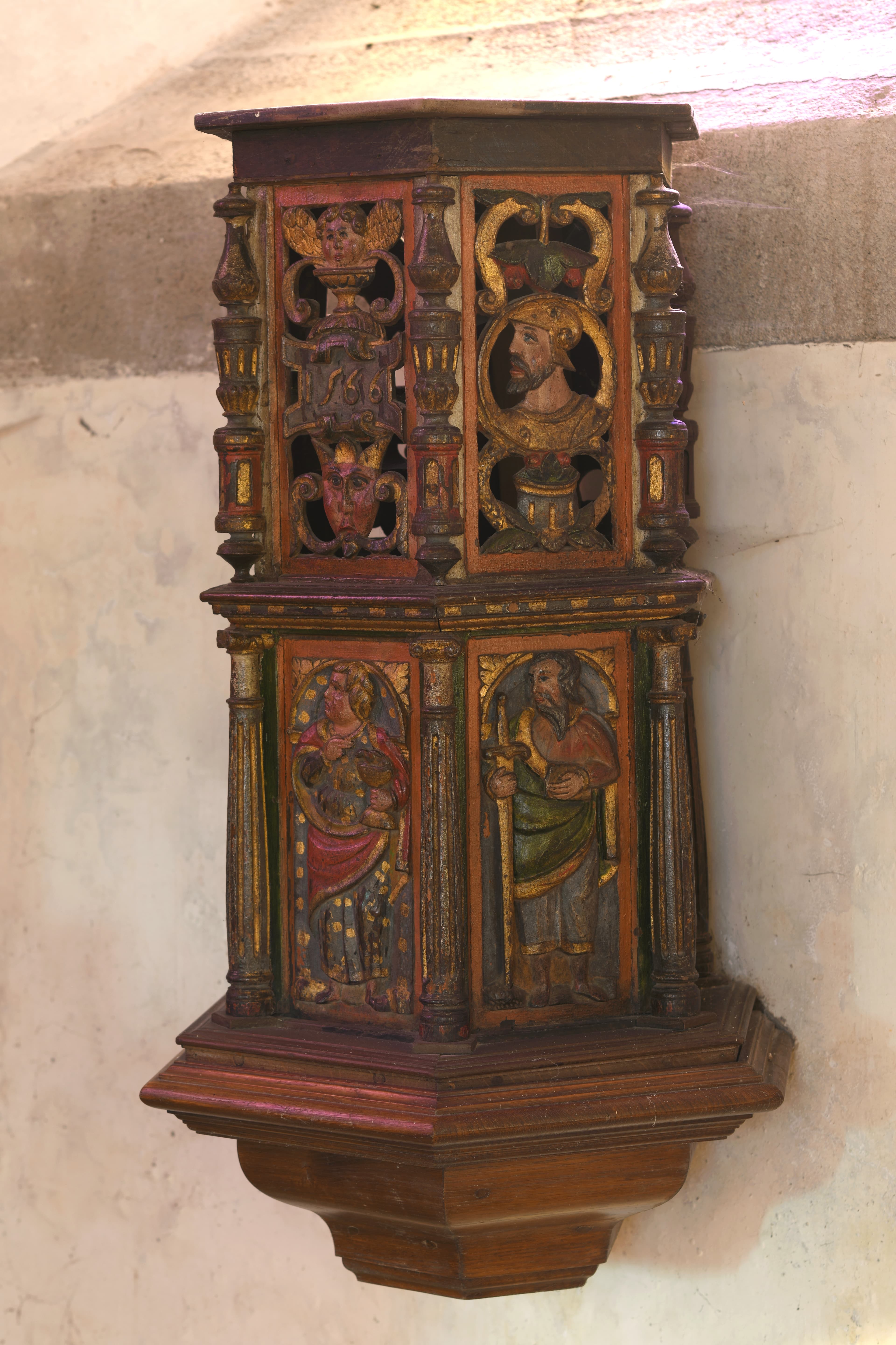 Cette tour eucharistique est de forme hexagonale et divisée en deux étages. Le 1er, plein, présente six niches séparées par des colonnettes et abritant des statues d'apôtres. Le second, en forme de lanterne, est ajouré. Les six pans, également séparés par des colonnettes, portent des panneaux sculptés.