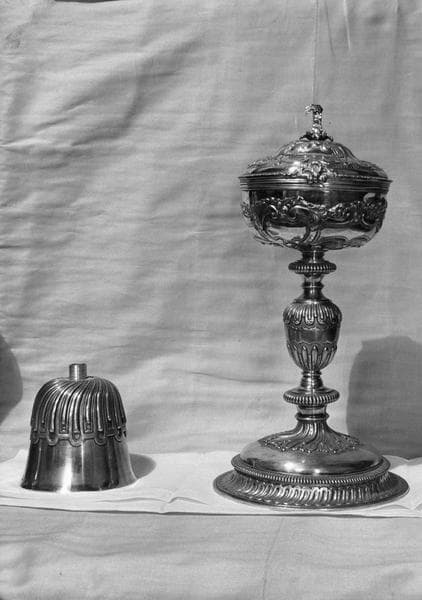 Ciboire et coupe de ciboire (couvercle à charnière) susceptible de se visser sur le pied d'un calice.