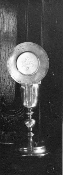 h = 22,5 ; d = 14,7 (Diamètre de la base) ; Dimension de la coupe : d = 8,5. Dimension de la patène : d = 14,2