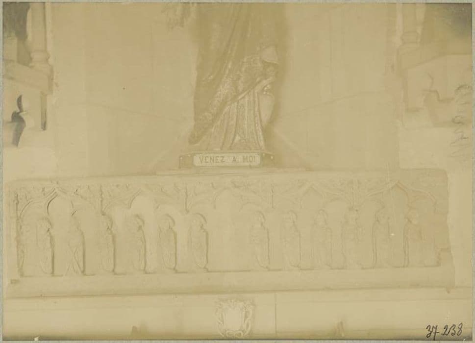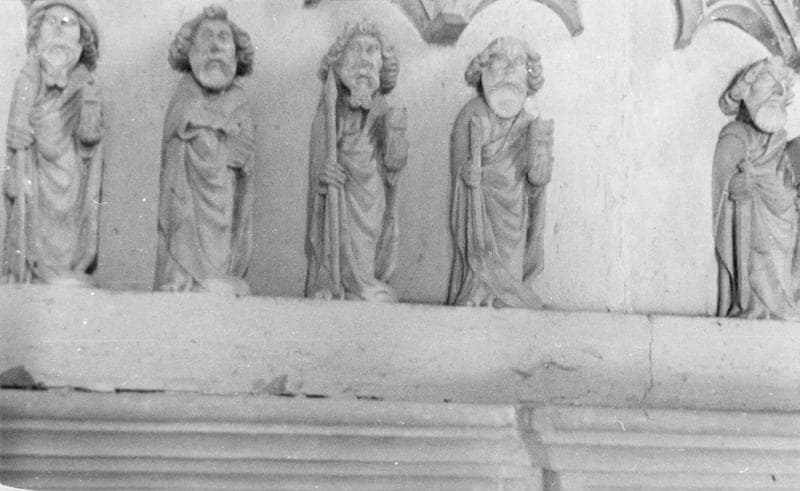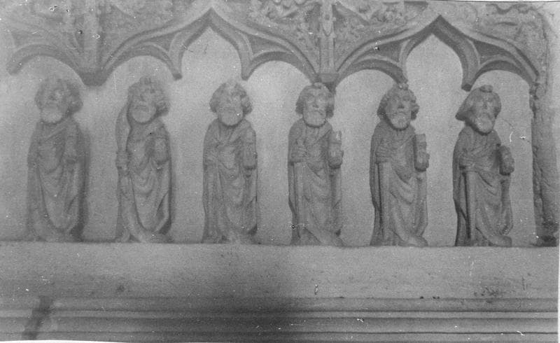 Retable aux douze Apôtres présentant des traces de couleur rouge. Le Christ en croix est manquant.