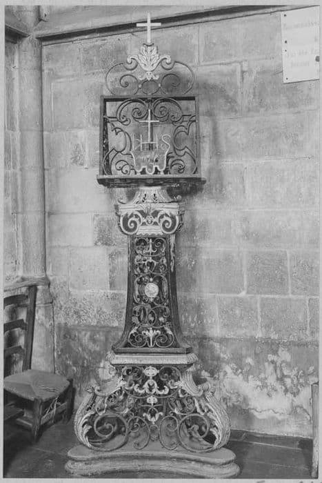 Ce lutrin à bâtière en fer forgé en partie doré est constitué d'un pied reposant sur trois volutes, surmonté d'un pupitre tournant à deux faces.