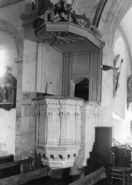 La cuve est en pierre calcaire sculptée, et l'abat-voix et le couronnement sont en bois sculpté, peint, doré.