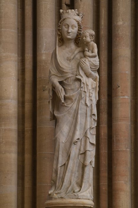 Cette Vierge à l'Enfant est en marbre blanc strié de veines bleuâtres. Les cheveux portent des traces de dorure.