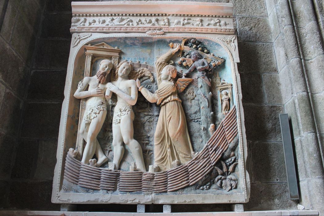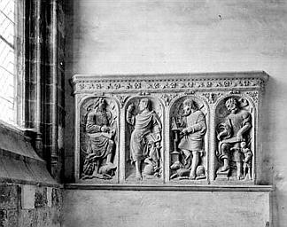 Ces bas-reliefs proviennent de la clôture du choeur. Ils représentent les quatre Evangélistes et leurs attributs, la Descente du Christ aux enfers, et Adam et Eve chassés du paradis terrestre.