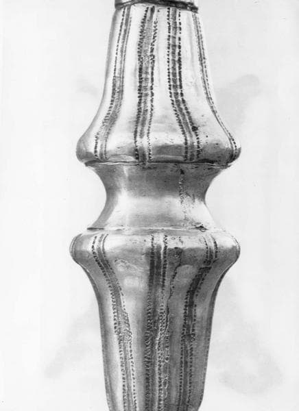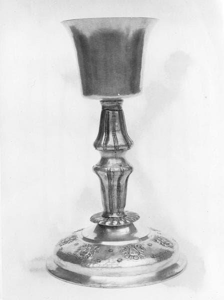 Calice en laiton martelé, soudé, rétreint, repoussé, gravé et argenté. L'intérieur de la coupe est doré.