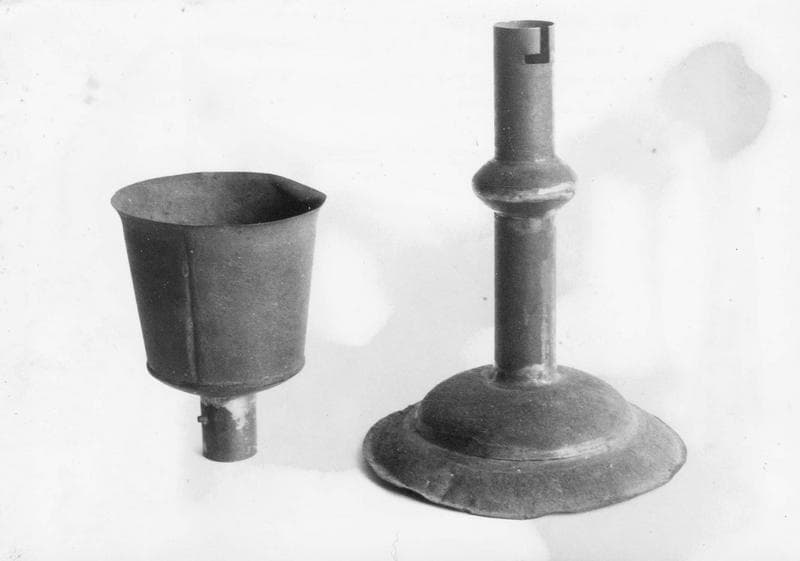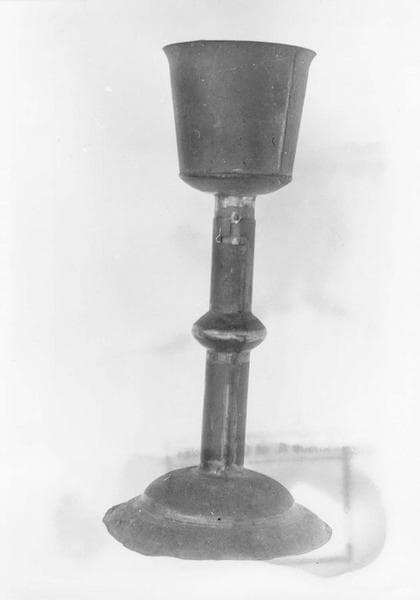 Tous les éléments du calice sont en ferblanterie soudée à l'étain. La coupe, de forme tronconique au bord légèrement évasé, est formée d'une bande soudée à ses extrémités et au disque concave qui lui sert de fond. Elle se prolonge par une petite tige, formée de même d'une petite bande soudée, qui s'enfonce dans le fût par une baïonnette. Le fût cylindrique est formé de deux bandes soudées et reliées à un noeud central constitué de deux collerettes concaves (armées de plomb), soudées sur leurs bords. Le pied circulaire est composé d'une calotte convexe, soudée au fût et à un collier convexe, dont le bord inférieur est légèrement aplati. Le pied est armé d'une calotte sphérique en plomb, dissimulée par une calotte concave en fer, servant de fond au pied. Une croix latine, exécutée à la pointe sur le revers, orne en relief la couronne.
