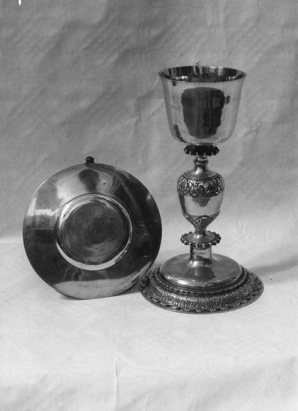 Calice à pied circulaire et noeud ovoïde. La patène ne comporte pas de poinçons.